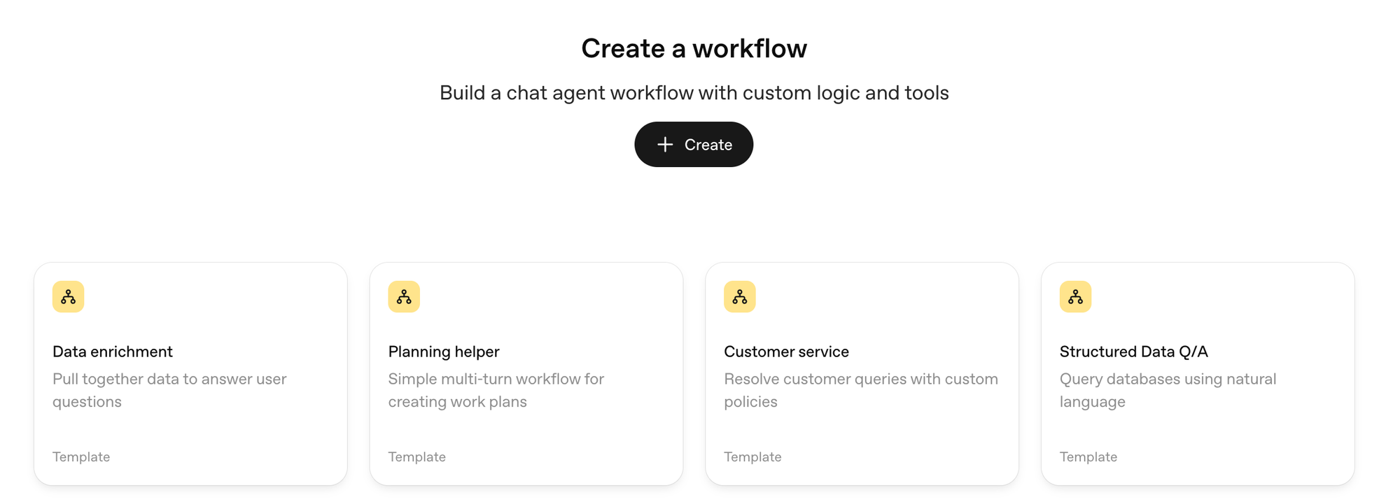 OpenAI 에이전트 빌더는 템플릿을 활용하거나, 완전히 새로운 커스텀 워크플로우를 설계할 수 있습니다.