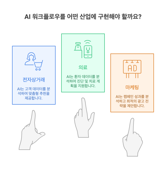 AI 워크플로우는 다양한 산업에서 활용됩니다. 몇 가지 예시는 다음과 같습니다: