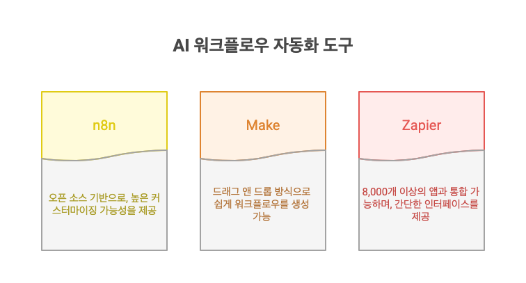 AI 워크플로우 자동화 도구는 다양하며, 각 도구는 고유한 기능과 장점을 제공합니다.