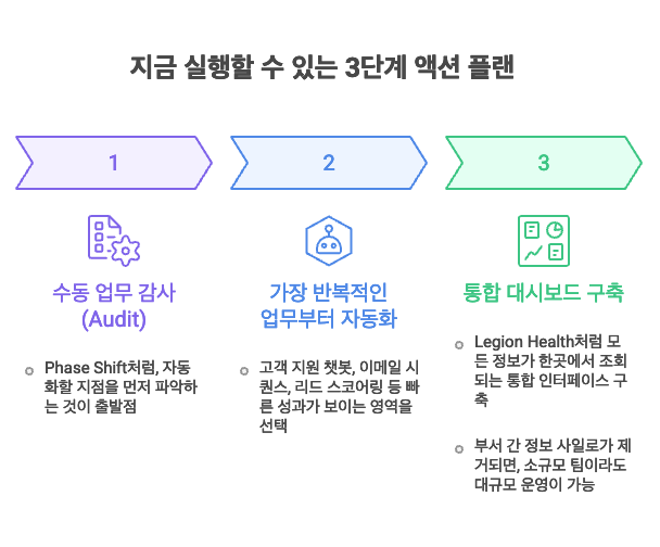 가장 반복적인 작업부터 자동화를 시작하세요. 고객 지원 챗봇, 이메일 시퀀스, 리드 스코어링 등 빠른 성과가 보이는 영역이 좋습니다.